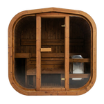 De deur en panoramische ramen zijn van gehard veiligheidsglas voor een moderne uitstraling en veel lichtinval. Onder de banken zorgt sfeervolle LED-verlichting voor een rustgevende ambiance, terwijl het ventilatiesysteem de lucht fris houdt en de warmte gelijkmatig verdeelt.