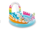 Intex Play Center Candy Zone is een compleet speeltoestel. Dit opblaasbare kinderzwembad heeft een snoep thema. Het kinderzwembad beschikt over een glijbaan, een sproeier en ballen om mee te spelen. Het is de kunst om de "Fun Ballz" via de glijbaan door de staande ringen te rollen.